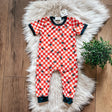 Covered in playful spiders and bold checkerboard squares, this cozy romper is made for spooky snuggles and Halloween fun. πŸ•Έβœ¨